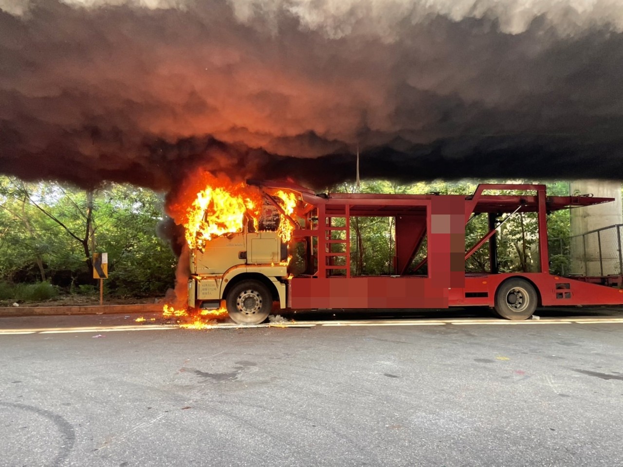 台中市74快速路橋下上午8點多發生一起托運車火燒意外,警消雖在20分鐘內即撲滅,但車頭全毀,所幸當時是靜止狀態,無人傷亡,濃濃黑煙往上翻滾,又受阻橋面,宛如核彈爆炸所形成的蕈狀雲,畫面甚為恐怖,據了解,車窗有破,是附近有遊民破窗縱火,或是其他原因自燃,有待調查中。