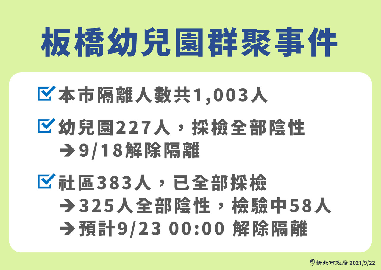 新北幼兒園群聚事件穩定控制,板橋社區匡列383人預計23日就能解隔。新北市長侯友宜下午在疫情記者會中說明,板橋幼兒園群聚隔離總人數共1003人,幼兒園227人採檢全部陰性,已於9/18解除隔離,至於板橋社區隔離383人中,有325人全部陰性,58人持續檢驗中,結果陸續下午出爐,若全部都是陰性,此案就能告一段落,預計9/23凌晨可解除隔離。