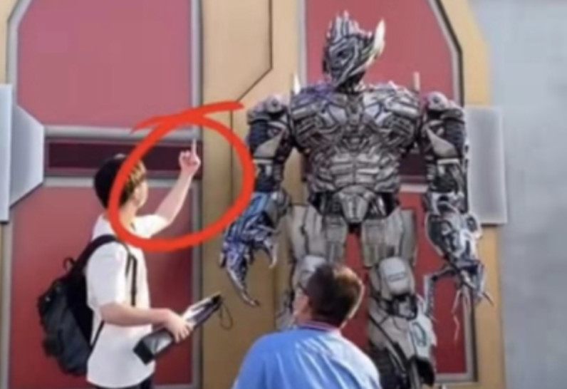 ▲北京環球影城網紅機器人威震天(密卡登)遭遊客比中指。(圖/翻攝九派新聞)