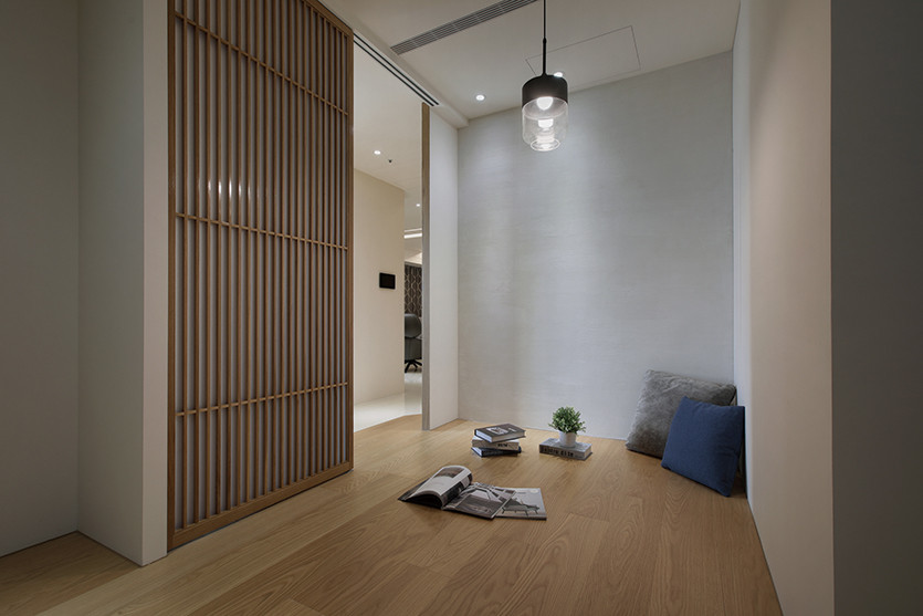 大面寬的窗外視野呼應室內的明亮清淨,自然光線投射至室內空間,模糊了室內與室外既有的界線,在虛實之間來回擺盪,家的空間經由光影投射的交錯與變化,藉此感受時間流動的步步軌跡,讓空間與心在此駐足,悄悄歇息。