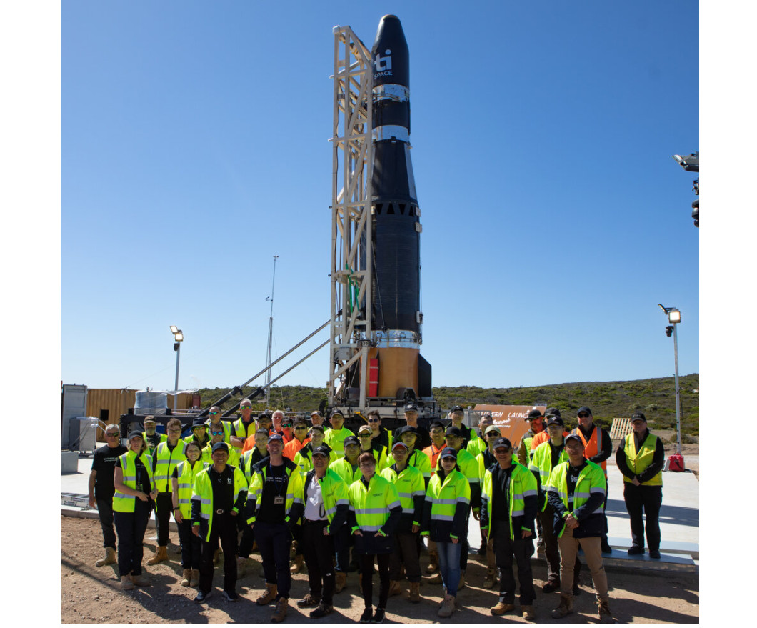 ▲台灣自製火箭「飛鼠一號」確定不發射,全體工作人員與火箭合照。(圖/翻攝自Southern Launch)