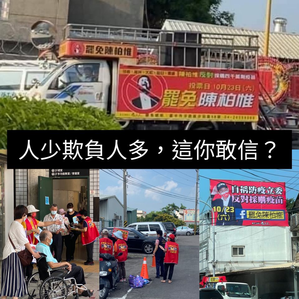 國民黨前立委顏寬恒日前宣告加入罷免台灣基進黨立委陳柏惟的「刪Q行動」,並批評陳柏惟「放任外來的基進黨成員騷擾、威嚇在地的鄉親志工」。陳柏惟23日回擊顏寬恒「你們動員的人數都比我在職的助理多」、「人少欺負人多,這你信?」,「不要幻想不是事實的文章」,也表示將「用盡所有力量守住這席」。