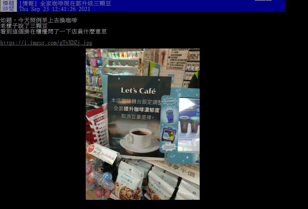 一些愛喝超商咖啡的民眾知道「3顆豆」密語點法,一位網友23日在PTT發文表示「全家咖啡現在都升級3顆豆」,表示自己今天照例點咖啡說了「3顆豆」,沒想到這個密語要走入歷史了。