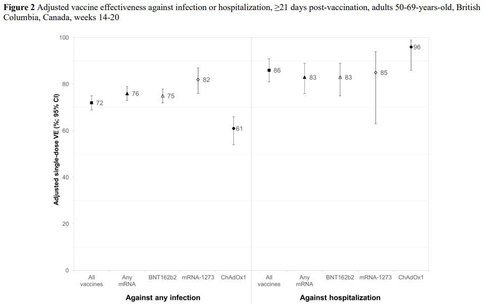 蘇一峰說,該研究蒐集2021年4月至5月間50到69歲成人施打疫苗與感染的資料,比對分析後發現6萬8074位民眾中有7116人染疫,當時加拿大有四分之三的人打mRNA疫苗(其中約60%是打BNT,15%打莫德納),另外四分之一的人打AZ,而主要流行的病毒株過半是Alpha,38%是Gamma,4%是Delta,還有8%為其他病毒。
