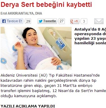 土耳其一名22歲女子塞特(Derya Sert)天生沒子宮,前年8月從死者移植子宮後,終於在今年4月接受胚胎移植受孕,然而她接受第八周的產檢時,肚中胎兒已經沒了心跳,醫生表示已為她安排終止懷孕。