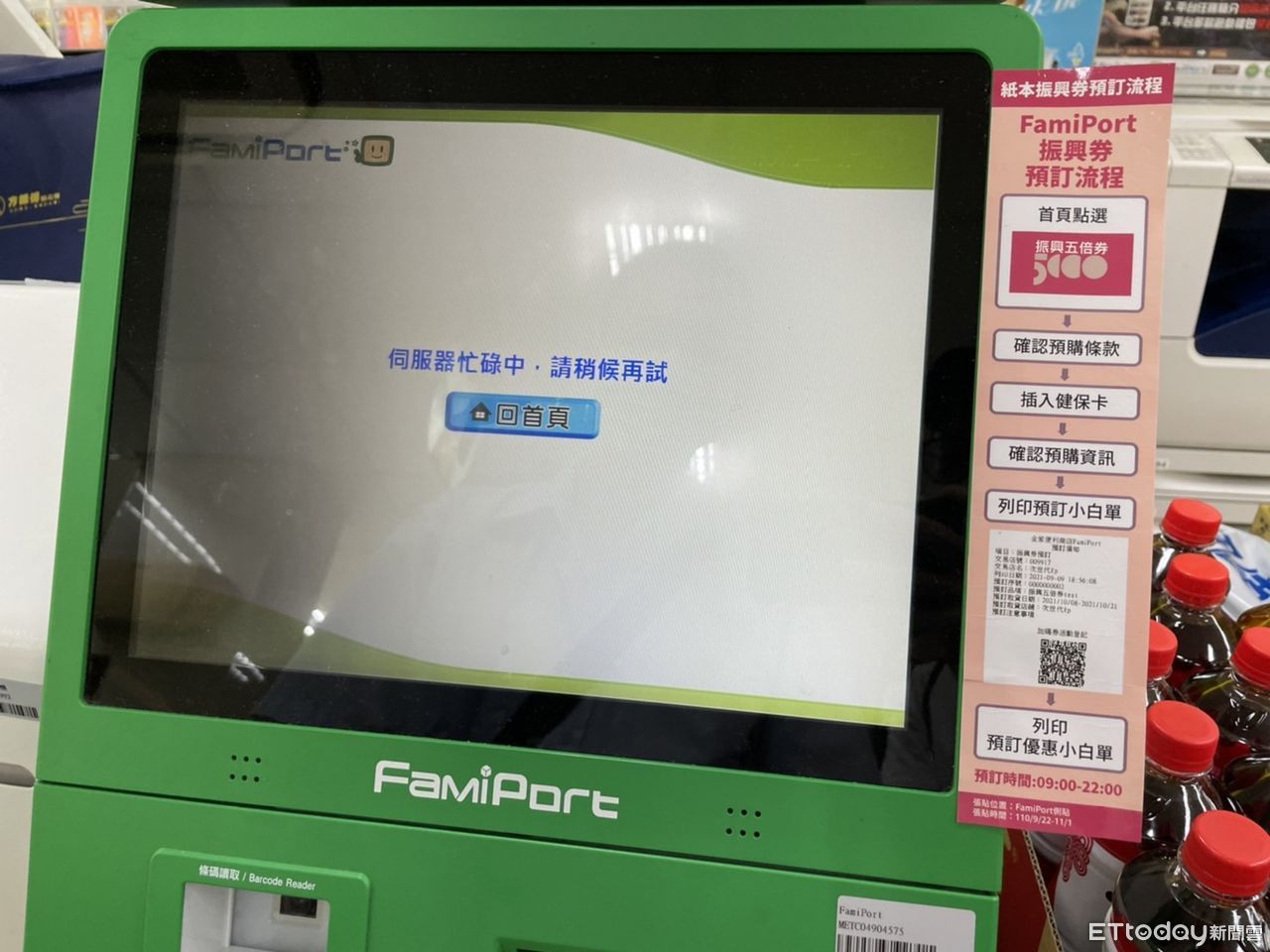 今(25)日為4大超商預訂「紙本振興五倍券」首日,4大超商皆為早上9時起開放民眾預訂登記,時間一到就開始出現排隊人潮,而《東森新媒體ETtoday》至7-11現場實測後,機台顯示「因預訂踴躍,系統繁忙,請稍後再試」,而全家也同樣出現伺服器忙碌情形,讓現場等候民眾直呼「完全進不去」。