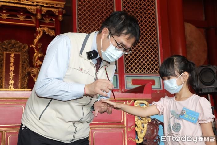 ▲2021台南孔廟文化節「啟蒙大典硃砂啟智」儀式25日登場,台南市長黃偉哲親自為小一新生點硃砂、啟智慧。(圖/記者林悅翻攝,下同)