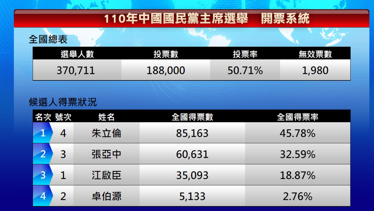 國民黨主席選舉中央選舉監察委員會召集人曾永權25日晚間公布110年黨主席選舉結果,朱立倫共獲得8萬5164票,以45.78%的得票率當選國民黨主席。