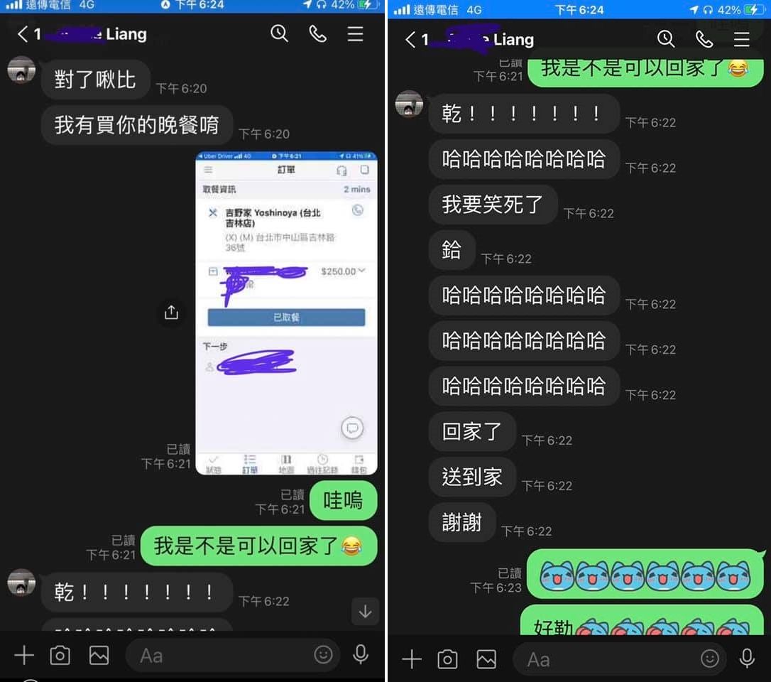 原PO透露,會發生這樣的事其實純屬巧合,女友也不知道叫的外送剛好就被他給接到,強調「真的只是剛好啦!單來了不接難道要棄單嗎。」他也曬出對話截圖,只見女友得知後刷了一排「哈哈哈哈哈;我要笑死了」,並要求「回家了,送到家謝謝」,訂單備註還暖心附上2顆愛心「請安全地快點喔」。