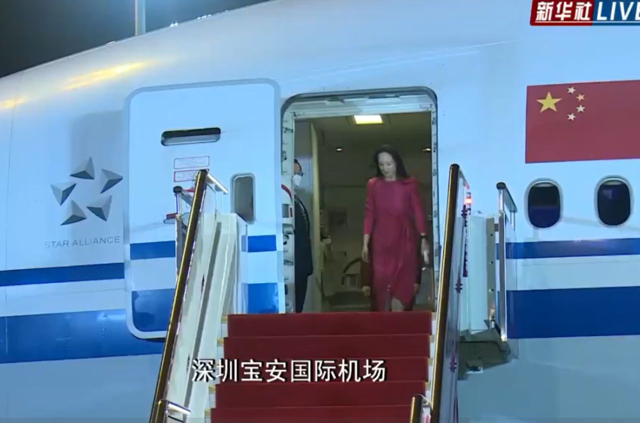 華為公主孟晚舟一行人的達成的中國政府包機,已抵達深圳寶安國際機場,現場不僅動員支持群眾揮五星旗聲援,甚至還拉紅布條、鋪紅地毯高規格接待,現場也有身著防護衣的防疫人員接待。孟晚舟下機後,隨即在停機坪上發表演說。