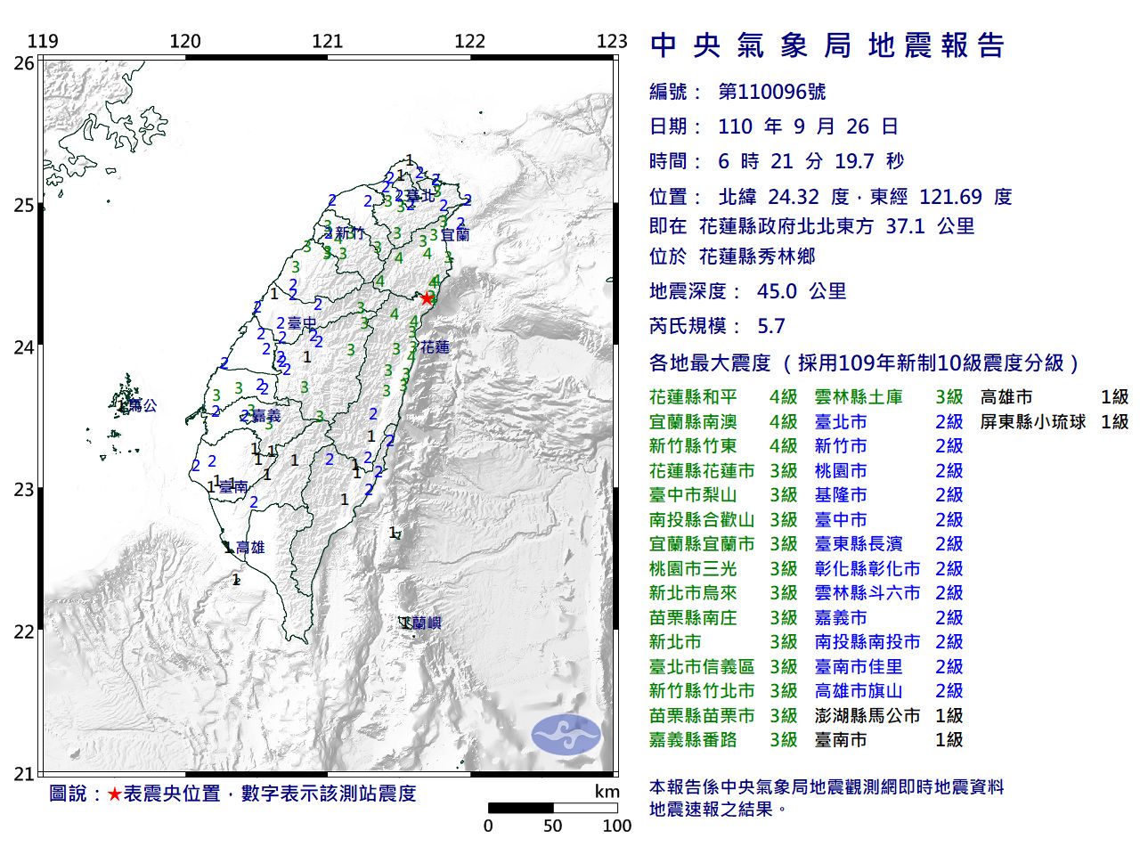 根據氣象局的地震報告,今晨6時21分發生芮氏規模5.7的有感地震,震央位於花蓮縣秀林鄉,地震深度45公里,花蓮縣、宜蘭縣、新竹縣最大震度4級,其他縣市也有1到3級震度,全台有感。