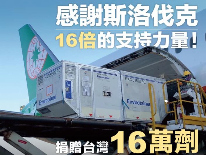 斯洛伐克原先計畫捐贈我國1萬劑AZ疫苗,日前宣布擴大捐贈至16萬劑,並於26日上午6時15分由長榮航空BR66班機運抵桃園機場。總統蔡英文26日中午也透過臉書表達感謝,並表示斯洛伐克的16萬劑AZ與日本捐贈的50萬劑AZ都優先提供第2劑接種。