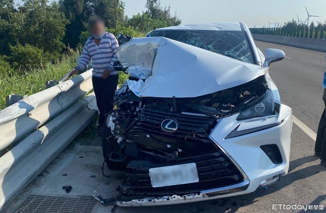 ▲白色休旅車遭板模砸中,車頭毀損嚴重,所幸無重大傷亡。(圖/記者黃孟珍翻攝,下同)