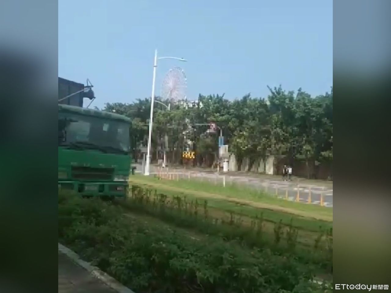 ▲貨櫃聯結車急切駛進輕軌旁自行車道。(圖/記者許宥孺翻攝)