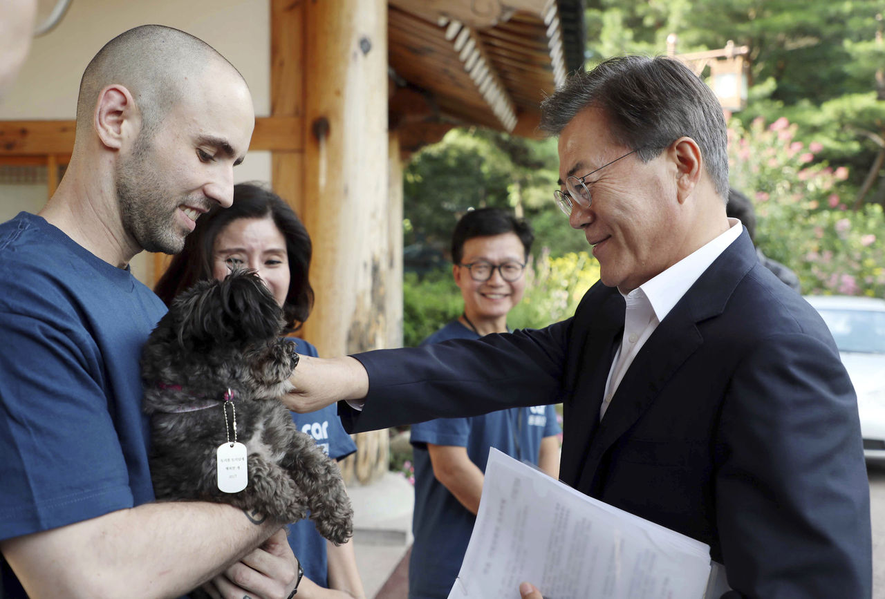 ▲文在寅2017年7月曾在青瓦台公開領養流浪犬「托利」。(圖/達志影像/美聯社)