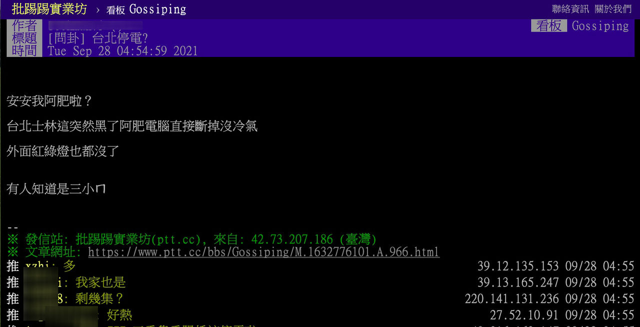 ▲批踢踢鄉民在凌晨發文透露士林區突然停電。(圖/記者葉國吏翻攝)