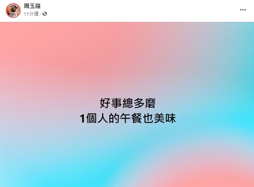 周玉蔻28日上午11時許,在臉書表示,「好事總多磨,1個人的午餐也美味」。接著,就有網友留言回應,「懂了」、「1個人」、「今天一例?」。