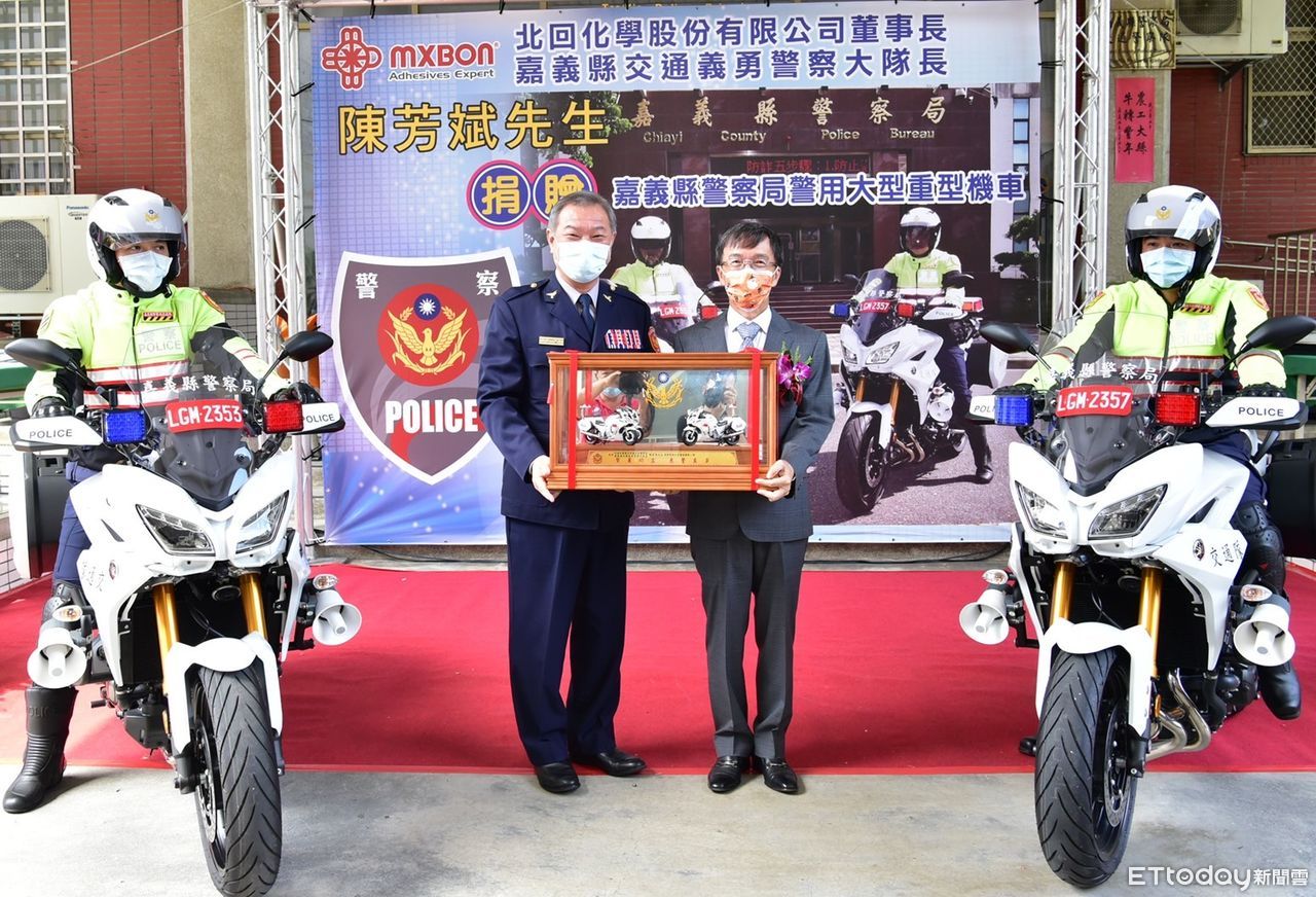 嘉義縣民雄工業區「北回化學股份有限公司」董事長陳芳斌,平時熱心公益且積極支持警政,更擔任嘉義縣警察局交通義勇警察大隊大隊長,有感警方維護交通秩序辛勞,以及提升執勤機動力的需要,29日慷慨捐贈兩部日本原裝進口的山葉YAMAHA TRACER 900 GT警用大型重機,提供嘉義縣交通警察隊編派勤務使用,警察局特別舉辦捐贈儀式,並由警察局局長廖訓誠回贈兩部同廠牌警用大型重機1:12仿真模型。
