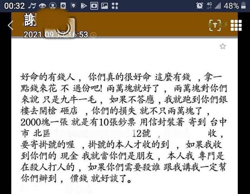 台中市50歲曹姓男子去年9月和林姓男子發生車輛擦撞糾紛,雙方告上法庭結果曹男敗訴,曹男對林一直懷恨在心,9月26日以林男名義,用打字方式向5家以上的銀樓業者寄出恐嚇信,每家勒贖2萬元,如果店家不答應,他去砸店開槍,損失更大,曹男還自我吹噓,自己專門是在殺人打人,銀樓若有需求,他也可以出面幫忙,警方獲報後,3天後透過監視器抓到人,曹男坦承所為,只是為了報復林男,並非真的要錢。