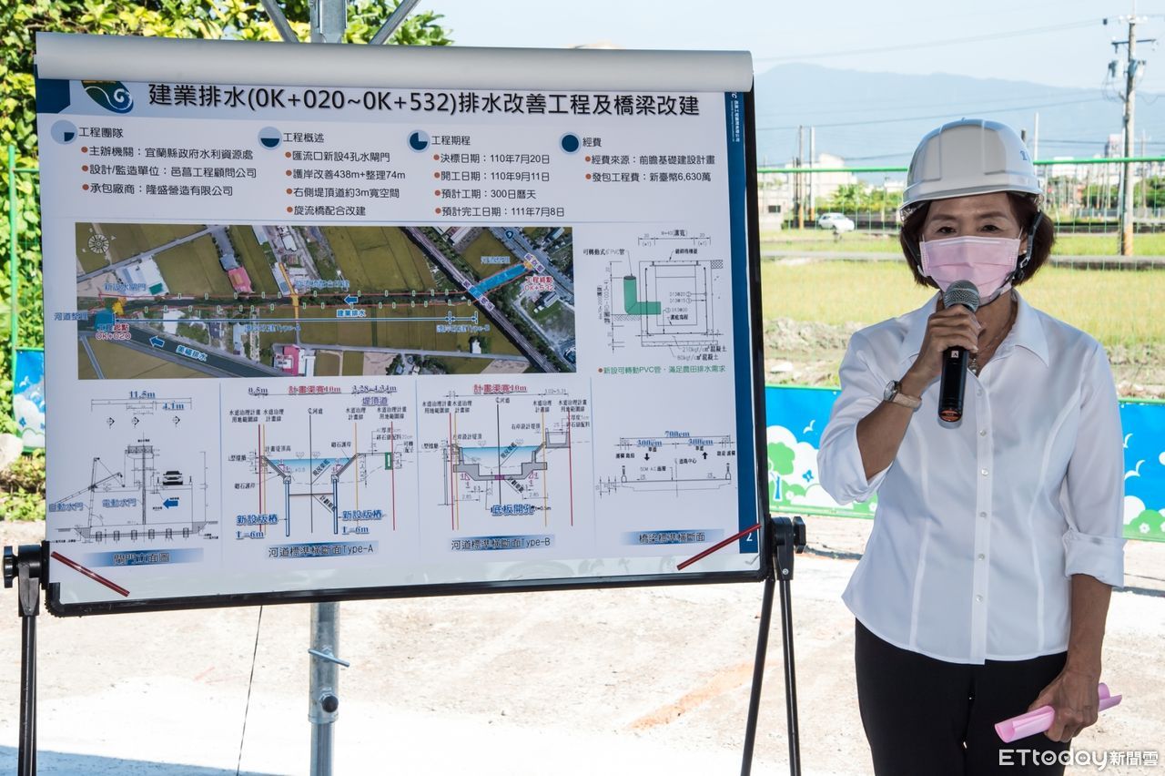 宜市建業排水土堤及老舊漿砌石護岸大多不堪使用、通水能力不足,有積淹水情形發生,宜縣府去(2020)年向中央爭取「前瞻基礎建設計畫」經費,獲補助辦理「建業排水(0K+020~0K+532)排水改善工程及橋梁改建」工程,宜蘭縣長林姿妙30日前往視察進度,並責成在考量品質及安全的前提下,如期在明(2022)年7月完成工程建設,杜絕水患。