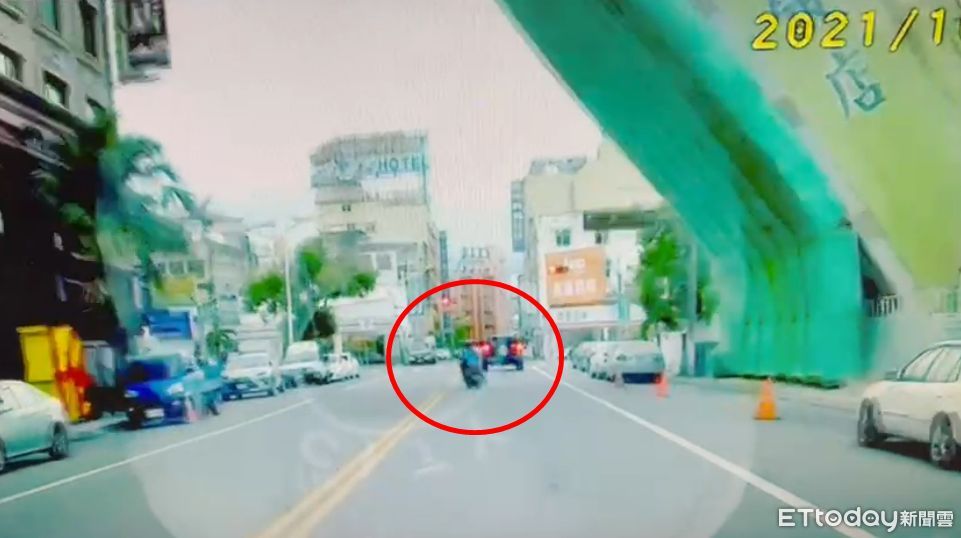 不過,前方的王姓騎士人在倒塌範圍內,當下疑似是發現地面陰影,下意識朝右上方看,才赫見飯店即將倒塌,趕緊向前騎,最後並未被壓到。令人怵目驚心的是,整個反應時間僅不到2秒,好在最終王姓騎士仍冷靜向前騎,最終化險為夷。