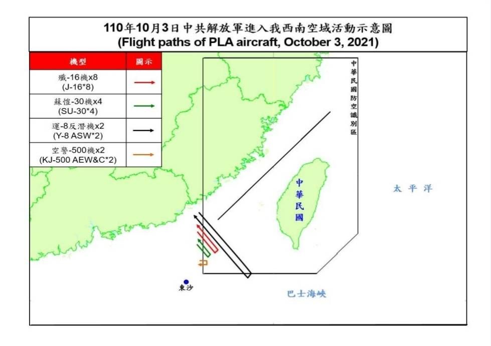 根據國防部公布資料顯示,截至10月3日為止,共軍在10月已出動93架次共機進入我西南空域,10月1日殲-16機18架次、蘇愷-30機4架次、轟-6機2架次、運-8反潛機1架次;10月2日殲-16機12架次、蘇愷-30機6架次、空警-500機1架次、殲-16機14架次、蘇愷-30機4架次、運-8反潛機2架次;10月3日殲-16機8架次、蘇愷-30機4架次、運-8反潛機2架次,以及空警-500機2架次。