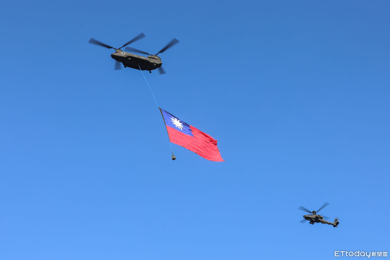 ▲國慶全兵力空中預演,CH-47運輸直升機吊掛巨幅國旗通過會場。(圖/記者林敬旻攝)