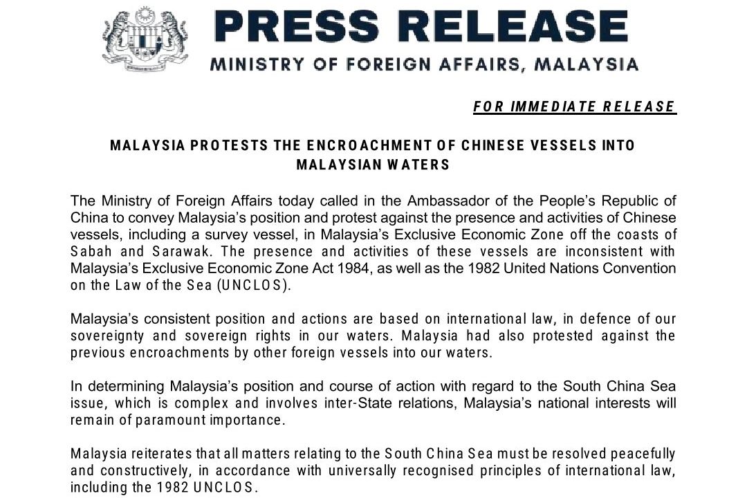 ▲ 馬來西亞外交部4日召見中國駐馬國大使表達抗議,並在會後發布新聞稿。(圖/翻攝自Twitter/@MalaysiaMFA)