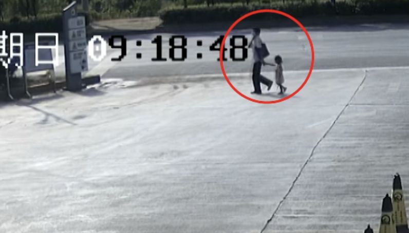 ▲人販子牽著孩子路過加油站。(圖/翻攝自央視新聞)