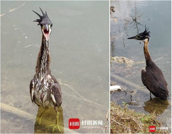 據陸媒報導,兩名男子陳述解救這個鳥類事發經過,他們發現有動物被釣線纏住,靠近一看發現是長相奇特的鳥類,並進行解救。他們說到,這隻鳥類獲救後,並不像一般鳥類立即飛走,而是站在水中發出「啊,啊,啊」的叫聲,他們覺得很特別並拍照錄影存證,事後經專家鑒定,才揭發這隻鳥類的真實身分。