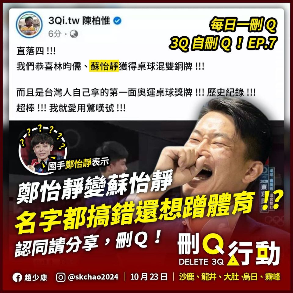 趙少康表示,今年東京奧運期間,中華隊國手表現大放異彩,發文祝賀分享喜悅無可厚非,但是陳柏惟發文卻把「鄭怡靜」寫成「蘇怡靜」,很明顯就是平時不關心體育,只忙著蹭熱度。