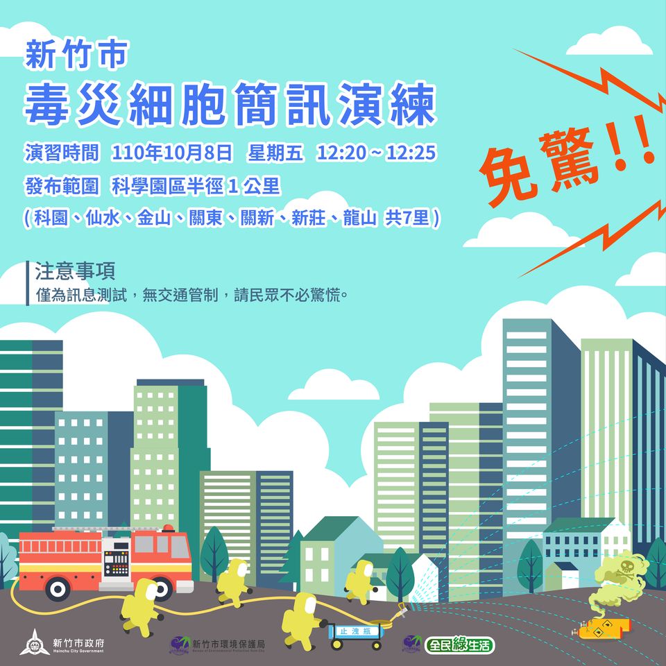 為配合新竹市「110年度毒性及關注化學物質災害搶救兵棋推演」,環保局將於10月8日(五)中午12:20至12:25,預先發送「新竹市毒災細胞簡訊演練」,簡訊對象為新竹科學園區內半徑1公里範圍民眾,預計涵蓋科園、仙水、金山、關東、關新、新莊及龍山共7里,訊息包含中英文各1則,持續約5分鐘。環保局特別強調,此簡訊,相關區域內並無毒化物洩漏或其他異常狀況,「純屬演練」請民眾不必驚慌。