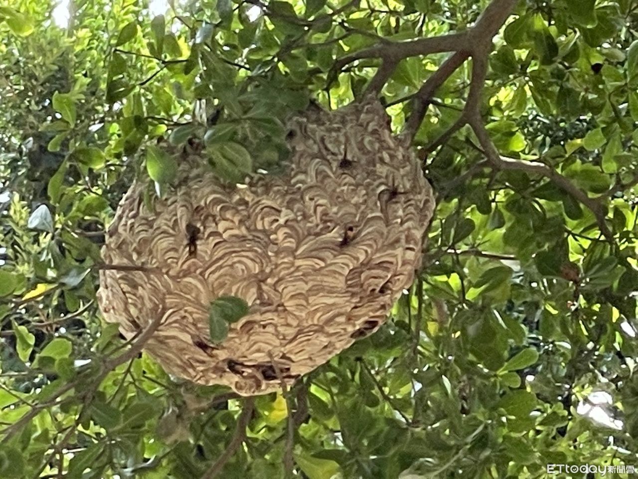 許文萍驚嚇的說,「真的太大了」,以前從沒有發現這顆虎頭蜂,也不知道牠是何時來築巢的,看蜂窩結構應該有一段時間了,也質疑有可能蜂窩是隱身在樹叢內,再加上圓規颱風來襲,風勢強勁下將風巢從樹中吹開,不過還好發現的早,沒有人因此受到虎頭蜂襲擊。