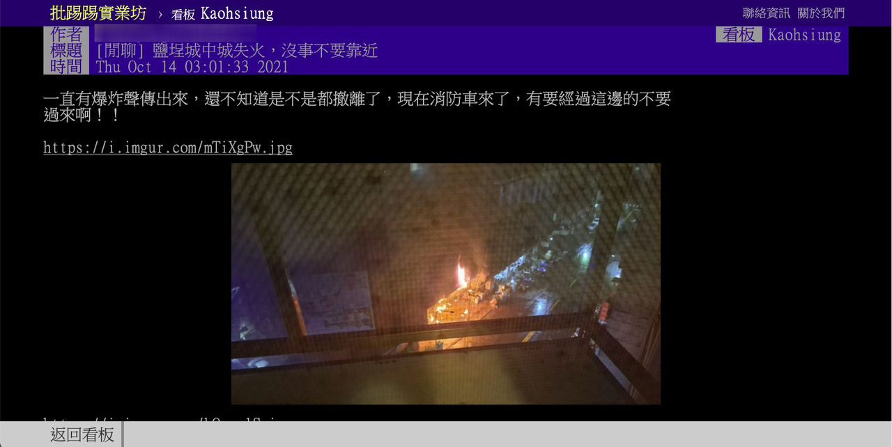 14日凌晨3點01分批踢踢有網友在高雄板貼文「鹽埕城中城失火,沒事不要靠近」,文中寫道「一直有爆炸聲傳出來,還不知道是不是都撤離了,現在消防車來了,有要經過這邊的不要過來啊!!」