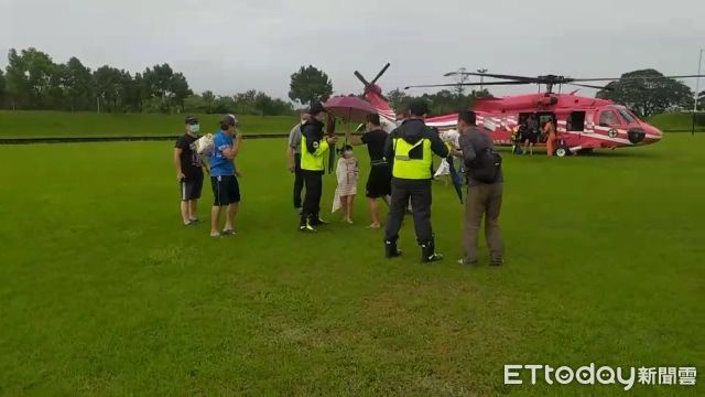 10大人3幼童在大同鄉石門溪野營,因颱風外圍環流溪水暴漲而受困4天,幸他們均安全無虞且食物充足,宜蘭消防局13日獲報後,派員與出動怪手前往搶救,但溪水太湍急了,至傍晚暫時撤退,今(14)早,經由直升機救援,13人安全被救至羅東綜合運動場。