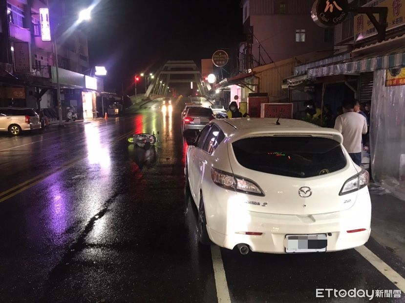 ▲台東市中華路2段豐里橋前機車與轎車交通事故,警方現場調查。(圖/記者楊漢聲翻攝)