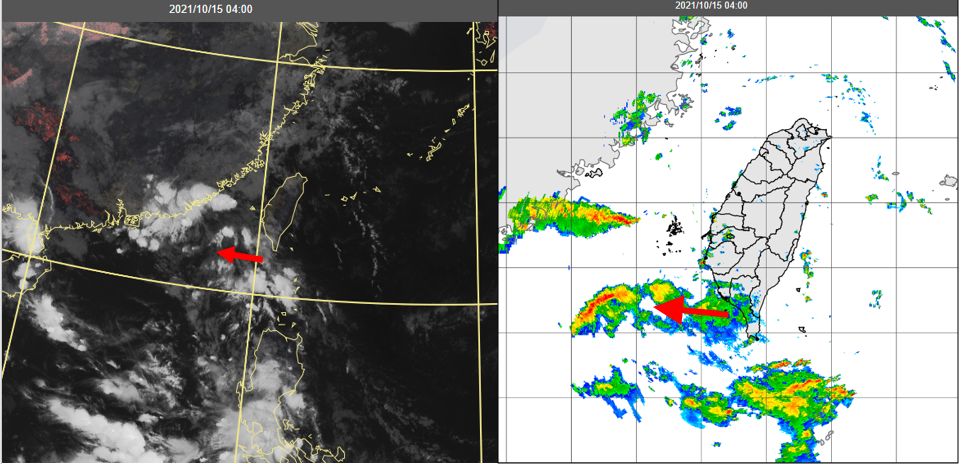 ▼左圖:今(15日)晨4時真實色衛星雲圖顯示,季風低壓環流被太平洋高壓向西推移。右圖:4時雷達回波合成圖顯示,季風低壓環流的邊緣,向西移動,正逐漸脫離台灣。(圖/翻攝三立準氣象· 老大洩天機)