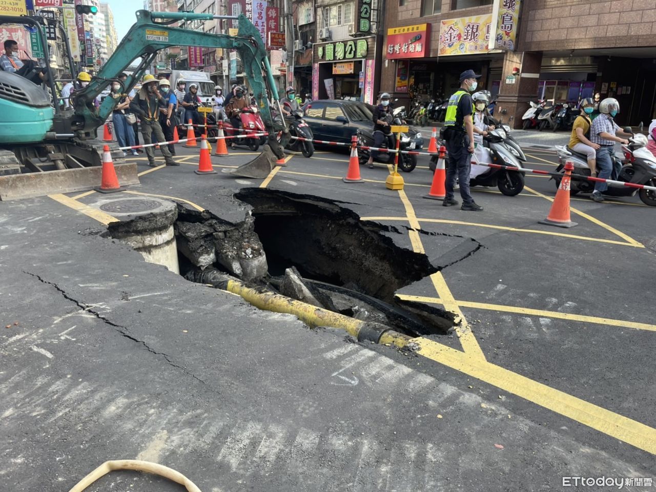 ▼三重出現3公尺深的道路塌陷,以挖土機挖開查看後判定為路基掏空。(圖/記者陳豐德翻攝)