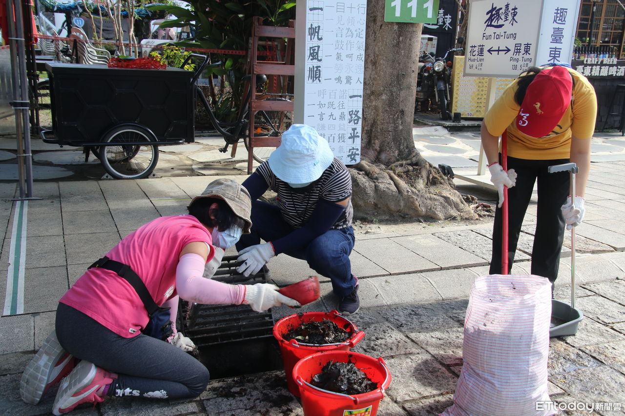 清掃活動從9點起分組在鐵花新聚落周邊進行清掃,由於前幾日大雨不斷,步道有不少落葉,排水溝也出現落葉或砂土淤積等問題,短短時間內,各組都清出好幾桶的泥砂,令饒慶鈴及現場志工感到不可思議,也請鄉親於假日清掃住家周邊環境衛生,一同美化環境。