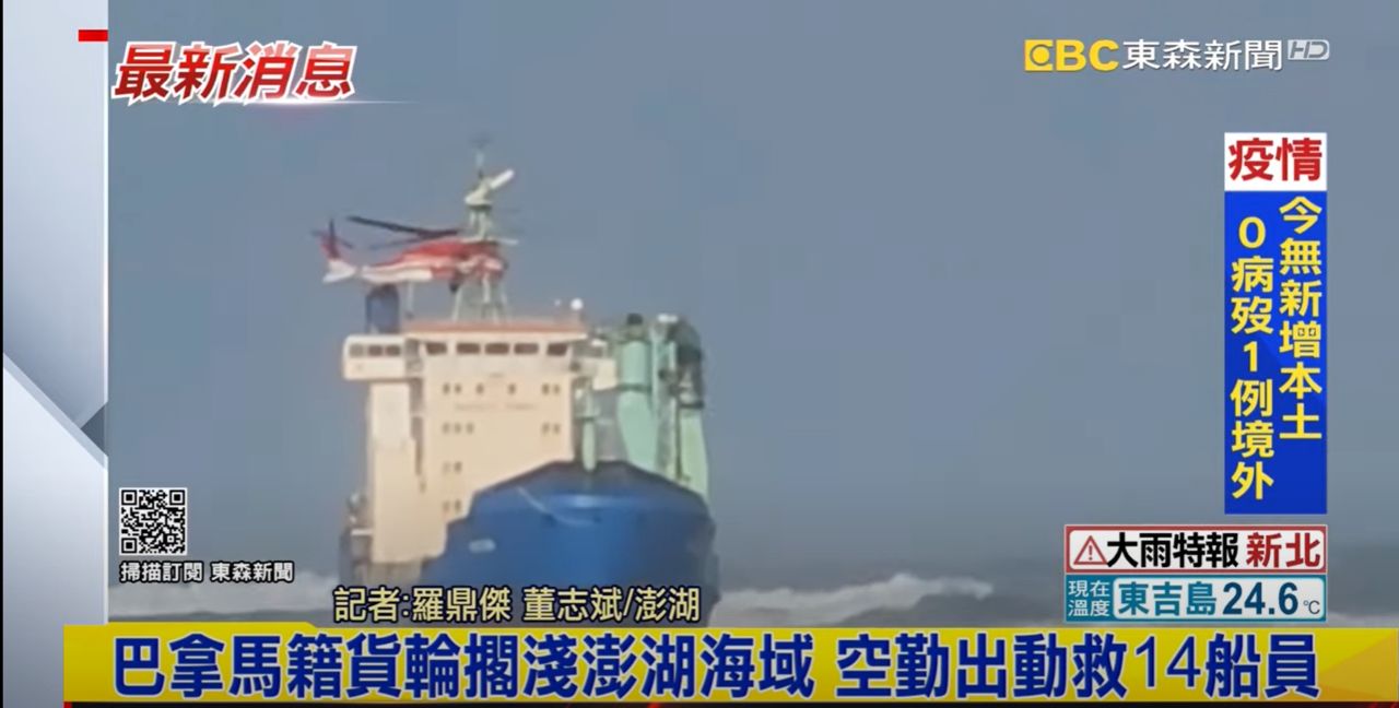 ▲一艘巴拿馬籍貨輪在澎湖北方待救,空勤總隊出動救援,成功撤離船上14人。(圖/翻攝自東森新聞,下同)