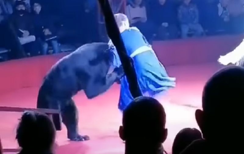 俄羅斯一場馬戲團表演發生攻擊意外,當時一頭脖子拴著鐵鍊的棕熊突然發狂,揮爪攻擊懷孕的訓練師,其他訓練師瘋狂揮鞭也沒用,現場畫面也在網路上曝光,景象相當恐怖。