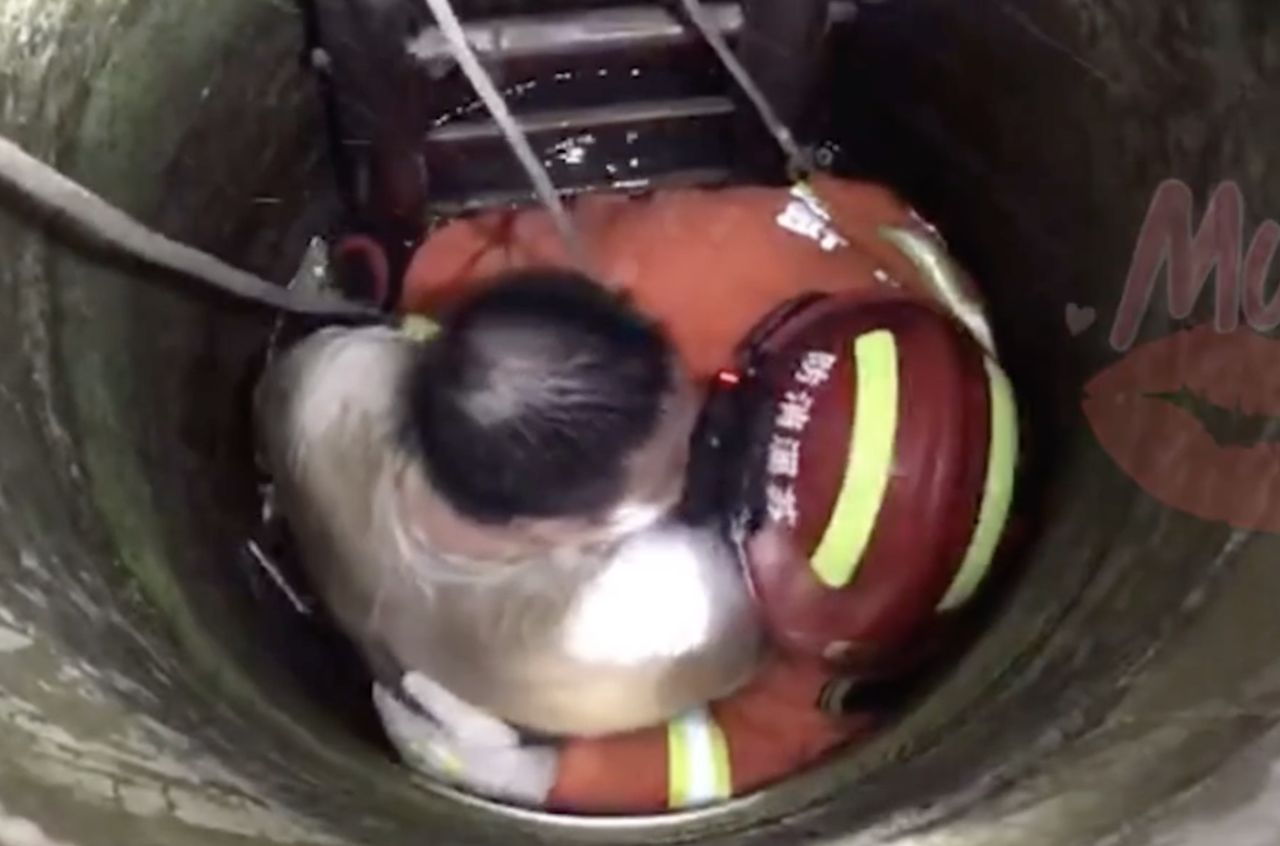 就在消防員為男子綁好救援繩的那一刻,男子竟突然強吻消防員,但由於井內非常狹窄,消防員完全無法閃避,地面上的其他消防員看了以後也當場震驚,急忙大喊,「兄弟!你冷靜一點!」
