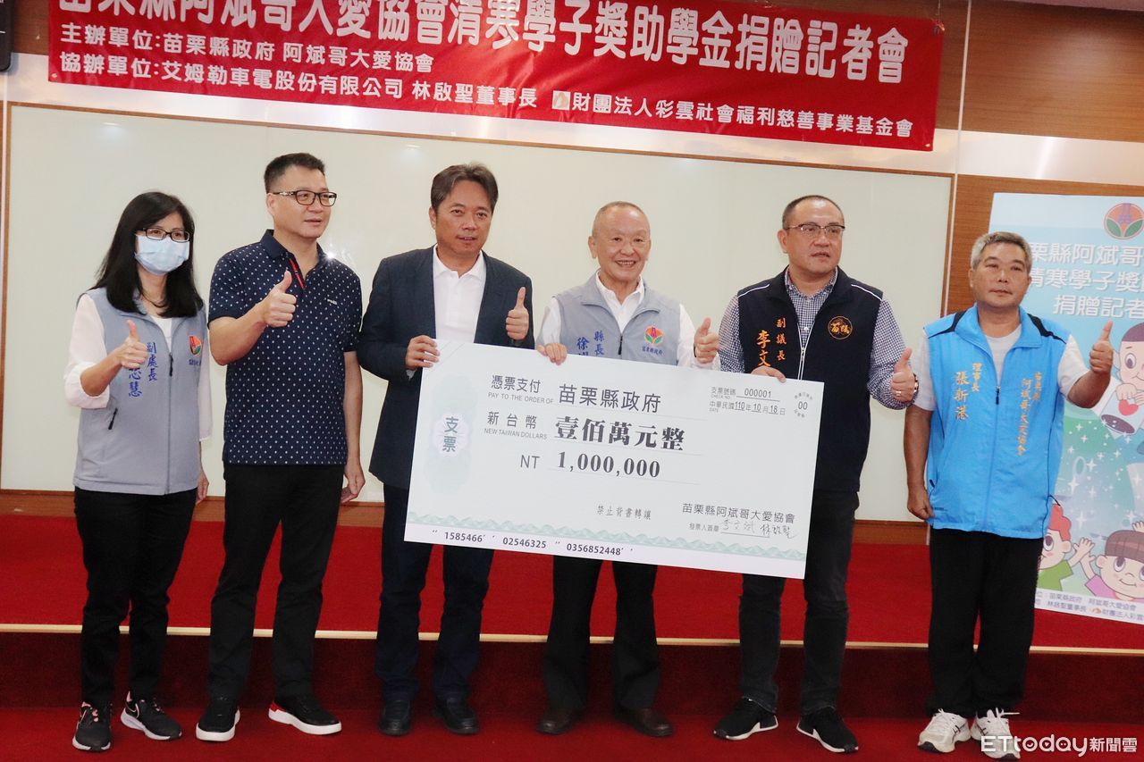 阿斌哥大愛協會18日上午與艾姆勒車電公司、彩雲社會福利慈善事業基金會,連續7年捐贈新台幣100萬元助學金予苗栗縣政府幫助家境清寒、家庭遭遇重大變故無力負擔學雜費的學童,至今已有191位學子受惠,也期許學童們努力向學,未來有能力也要回饋社會,以「取之社會,用之於社會」為人生理念。