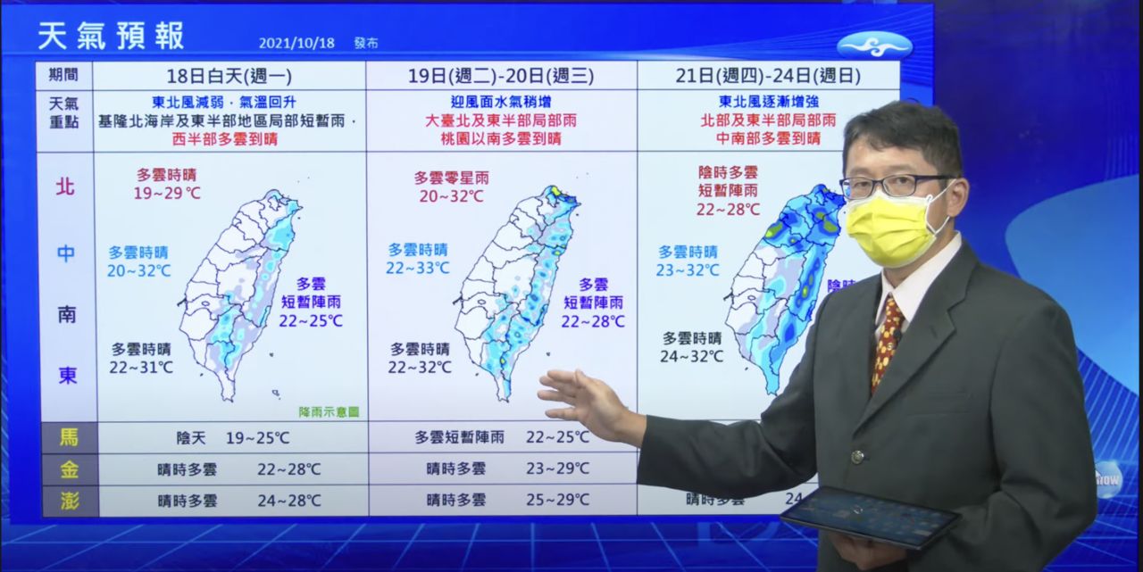 氣象局下午召開線上記者會,中央氣象局技正王君賢說明,隨東北風減弱、迎風面降雨逐漸趨緩,今天下午僅基隆北海岸有零星降雨,午後中南部也有零星降雨,預估雨勢趨緩可持續至週三(10/20),期間東北風減弱北部回溫,北部多雲零星有雨,中南部則是多雲到晴。