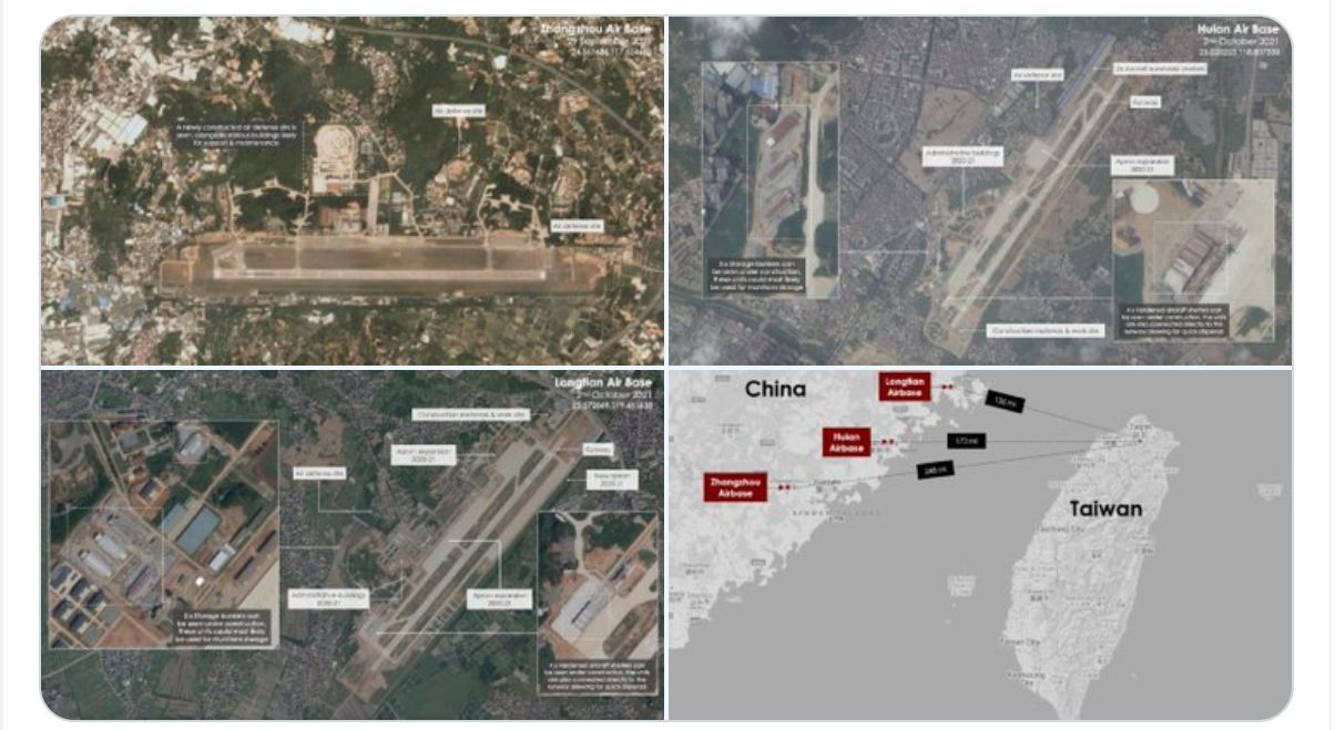 ▲衛星照片顯示,解放軍對鄰近台灣的3處空軍基地進行擴建。(圖/翻攝自Twitter/www.anoncandanga.com)