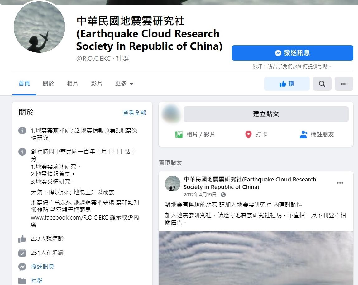 地震雲研究社創立於2011年,宗旨為地震雲前兆研究、地震情報蒐集、地震災情研究,「我們雖然沒有國家地震研究中心的補助經費及各類高貴儀器,但我們有天生的雙眼,少數朋友已進化成數位的單眼,越簡單!人人都會!又能實際幫助到民眾的越顯得有價值!大家分散各地出遊、上班時間都不一樣 ,沒有對與錯,試著去拍下來,及寫出所在地與拍攝方位,純粹研究地震雲,不作任何地震預報也不製造社會恐慌,大家一起討論、一起學習!」社團營運至今已有6200餘名社員。