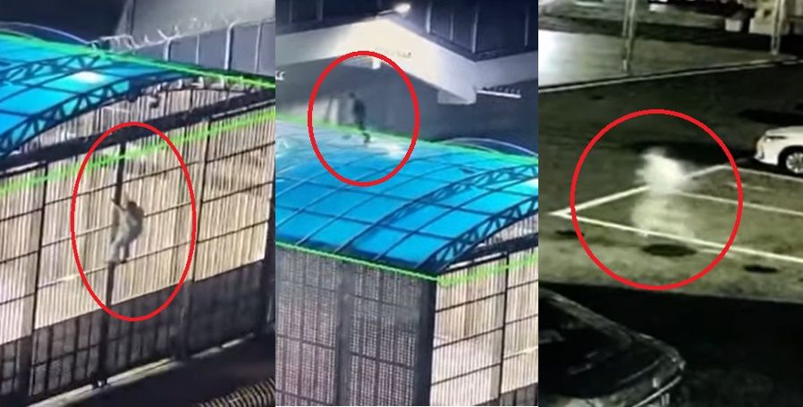 ▲身手靈敏的朱賢健爬上圍欄後利用全身力氣跳到高點,接著爬上頂棚並跳牆脫逃。(圖/翻攝自微博)