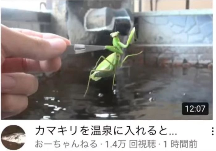 據日媒「J-Castニュース」報導,日本YouTuber「おーちゃん」喜歡在頻道上分享昆蟲、釣魚等自然風格的影片,擁有高達112萬的訂閱人數,不過近日他上傳了一部引起爭議的影片,內容是他將「有寄生蟲的螳螂」放進溫泉裡。