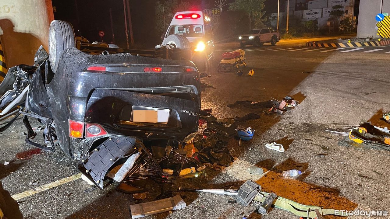 ▲黑色轎車自撞橋墩翻覆,四輪朝天,車體也面目全非。(圖/記者李忠憲翻攝)