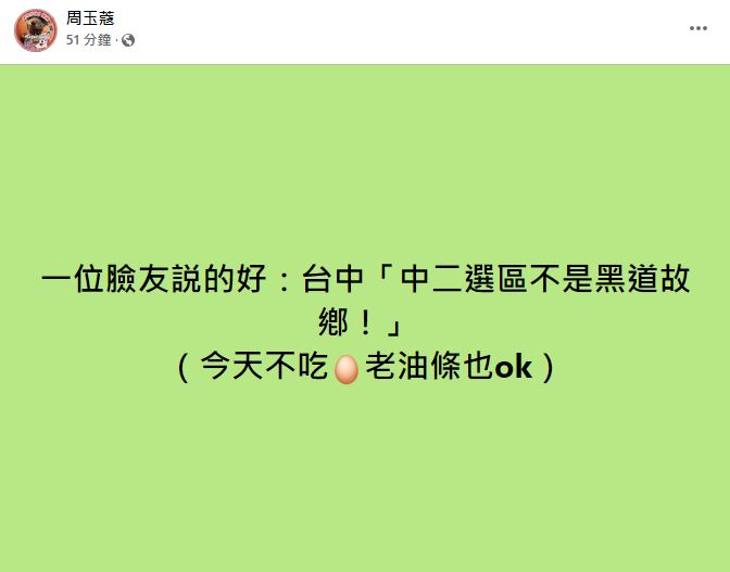 周玉蔻過去多次透過臉書預告確診數,並經常以「蛋」的圖案暗示+0,而今天PO文則表示「今天不吃蛋,老油條也ok」。有網友發問,「油條!兩邊唷!」、「+2?」,周玉蔻親自回覆「聰明」;還有網友也說,「有舊案代表很認真在清零。越清越乾淨」,周玉蔻大讚網友「好聰明」。
